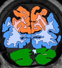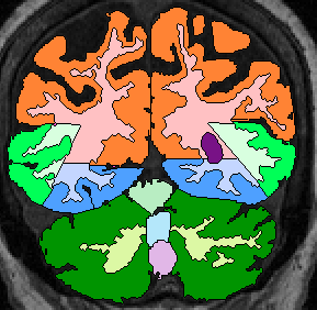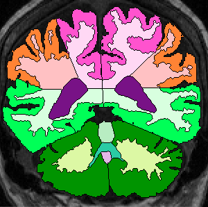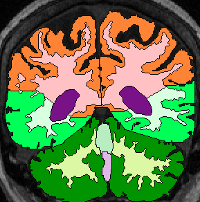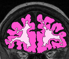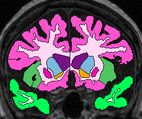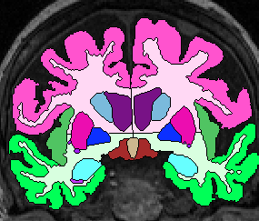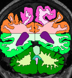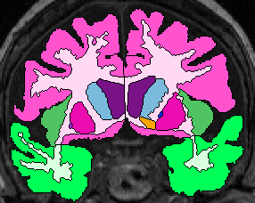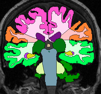 | Procedure for White Matter Parcellation: Frontal Lobe White Matter: Change "cerebral white matter" on every slice that has frontal lobe present on it to "frontal lobe white matter." This will, on some slices, for the time being, change some white matter that is actually temporal or parietal white matter to frontal lobe white matter. This will be corrected later on, however. |  (fig 1) |