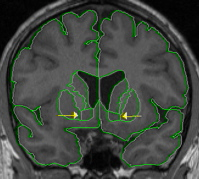 |  | Part II - Caudate and putamen are continuous When caudate and putamen are connected, an oblique line should be drawn from the inferior most tip of the lateral ventricle to the inferior most tip of the internal capsule (the white matter area between the caudate and putamen). If the white matter tip is an "island" it should be connected with a line to the rest of the internal capsule and the division lines should be drawn with the "island" as the reference. Adjust the intensity contour to clearly see the full extent of white matter, to it's most inferior extent. This line will create the border between the caudate and the accumbens. From this point, a straight, vertical line should be drawn to provide the border between accumbens and putamen. The accumbens should end a slice or two in front of anterior commissure. |