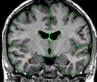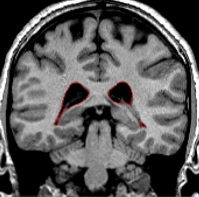 |  | Anteriorly, the ventricle will appear more as a curved structure which follows the rounded lateral edge of the hippo-amyg area. Moving posteriorly the inferior lateral ventricle will comprise the border between the hippocampus and amygdala. Create an intensity contour line for the ILV. Your contour line will approximate the value of the lateral ventricles and/or the part of the tightened exterior that borders the hipp/amyg area. Once complete, extract this outline from the outside, and then the inside. It is also acceptable and more accurate to use a multiple-peaked histogram for the ILV, when accuracy is important. It is possible to draw one box that contains all three of the structures that make up the ILV borders (CSF, white matter, hipp/amyg), and then use the corresponding peaks to create the ILV outline. The first to second peaks will represent the CSF to hipp/amyg (gray) averaged intensity, and the second to third peaks represent the hipp/amyg (gray) to white matter averaged intensity. Use the "v" function to create the outline. |