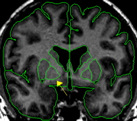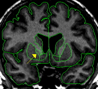 | General Description  In the coronal view the pallidum resembles a rounded triangle that continues off the putamen. The pallidum starts anteriorly as a small triangle and reaches its largest extent in its most medial slices and then dwindles to a small triangle again in the most posterior slices. The pallidum is essentially surrounded by white matter except for the lateral border which is the putamen. The putamen and pallidum are separated at this border by a thin strip of white matter called the lateral medullary lamina. Medially, pallidum is difficult to discern from the surrounding white matter because although it is gray, in terms of its intensity, its darkness is frequently fainter than putamen.  Procedure | |
